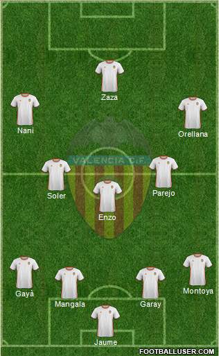 XI VALENCIA: Doménech; Montoya, Garay, Mangala, Gayà; Orellana, Parejo, Medrán, Nani; Rodrigo, Zaza