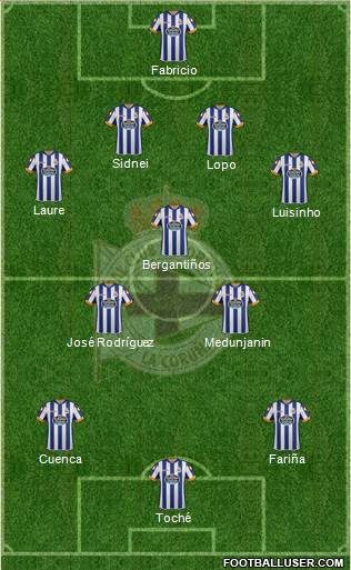 Mediocentros: Álex Bergantiños, Medunjanin, José Rodríguez, Juanfran, Cuenca y Fariña.