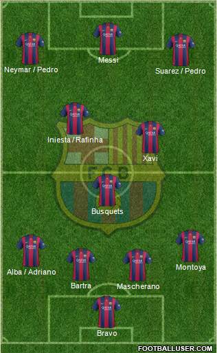 Ter Stegen, Bravo, Montoya, Piqué, Sergio, Xavi, Pedro, Iniesta, Suárez, Messi, Neymar, Rafinha, Mascherano, Bartra, Jordi Alba, Sergi Roberto, Adriano y Dani Alves.