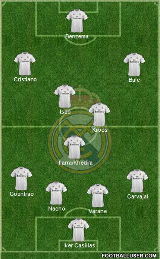 - Centrocampistas: Kroos e Isco serán titulares. La gran duda la encontramos en su acompañante en la medular con hasta tres opciones: Lucas Silva es el que no parece contar con posibilidades para este partido ya que todavía no ha podido debutar con la elástica blanca. Así pues la titularidad se la disputarán a partes iguales Illarra y Khedira. El primero fue titular ante la Real mientras que el teutón lo fue ante el Sevilla. Ambos tuvieron una actuación discreta por lo que quizás el alemán parta con ventaja por su mayor experiencia en partidos de altos vuelos.