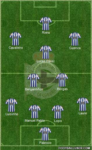 - David Gómez, Fabricio; Manuel Pablo, Canella, Laure, Luisinho, Lopo, Borja López; Bergantiños, Medunjanin, Juan Domínguez, Wilk, Borges, Hélder Costa, Lucas Pérez, Cavaleiro, Cuenca y Riera.