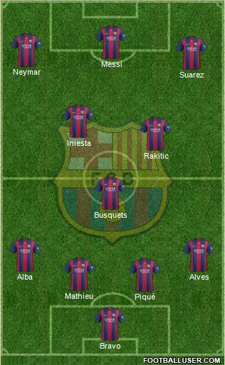 Ter Stegen, Bravo, Alves, Adriano, Alba, Mathieu, Piqué, Bartra, Sergio, Mascherano, Xavi, Iniesta, Rakitic, Rafinha, Pedro, Neymar Jr, Messi y Luis Suárez.