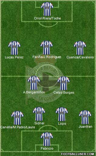Centrocampistas:A priori deberia seguir la dupla Borges-Bergantiños,me parece improbable que entre J.Dominguez,pero no lo descarto al 100% si buscan algo mas de creatividad.Por otra parte L.Perez parece fijo,luego puede haber dudas entre Cuenca-Cavaleiro y Fariña-J.Rodriguez,no necesaramiente por este orden,en mi opinion parten con ventaja Cavaleiro y J.Rodriguez,aunque tanto Cuenca como Fariña pueden ser de la partida.Repito,es dificil saber como va a jugar Victor.