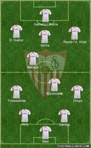- Centro del campo: Krychowiak y Banega en la medular, con Iborra en la mediapunta, y bandas para Reyes o Aleix, y D. Suárez.