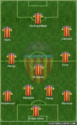 La alineación con la que trabaja Prandelli para el partido ante el Deportivo es la formada por Diego Alves; Cancelo, Garay, Mangala, Montoya; Mario Suárez, Enzo Pérez; Munir, Parejo, Nani y Rodrigo, de nuevo, como 9