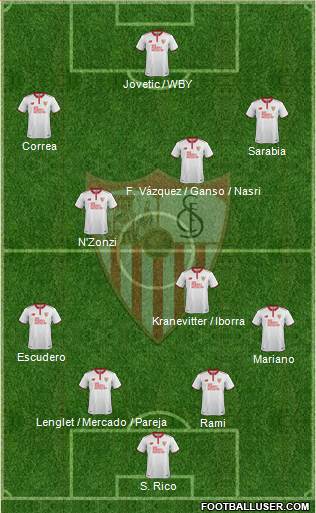 - Centro del campo: Kranevitter / Iborra y N'Zonzi formarán un doble pivote, siendo la zona de 3/4 para Sarabia, Correa y uno entre Franco Vázquez, Ganso y Nasri.