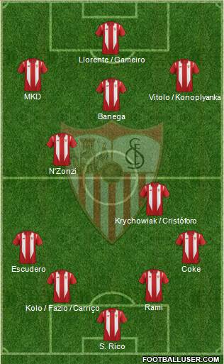 - Centro del campo: En el mediocampo más dudas, ya que Krychowiak podría dejar el pivote defensivo para Cristóforo, siendo N'Zonzi el acompañante de uno u otro en la medular. En la zona de 3/4, Banega estará en la mediapunta; y por las bandas Vitolo / Konoplyanka y MKD.