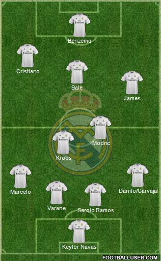 - Centrocampistas: Kroos y Modric son inamovibles en los esquemas del técnico. Junto a ellos se perfila como titular James, quien parece haber recobrado el tono físico que le dejó fuera del once en la primera jornada. El colombiano parece que tirará de galones en detrimento de Isco quien esperará su oportunidad saliendo desde el banquillo. Con la vuelta de Benzema se volverá al clásico sistema de tres jugadores en el medio, tan habitual con Carletto.