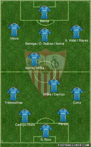 - Centro del campo: M'Bia e Iborra fijos, y de no llegar Banega a tiempo, podría ocupar su sitio Denis Suárez o el propio Iborra, dejando el valenciado el pivote al ya mencionado Carriço. La banda derecha entre Aleix y Reyes, y la izquierda para el incombustible Vitolo salvo sorpresa.