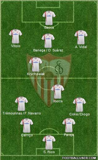 Sergio Rico, David Soria; Coke, Diogo, Navarro, Trémoulinas, Pareja, Carriço; Krychowiak, Banega, Iborra, Vitolo, Aleix Vidal, Reyes, Denis Suárez, Deulofeu, Bacca y Gameiro.